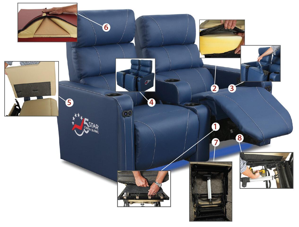 Universal 9 gauge metal chassis platform - Advanced engineering for easier and more efficient installation Exclusive Patented C-Spring Rocking System Morley Spring System - Providing better ride and extends the life of the cushion All seat cushions and arm padding are made of commercial grade, high resilient foam USB port on all seats - Power source does not draw power until activated